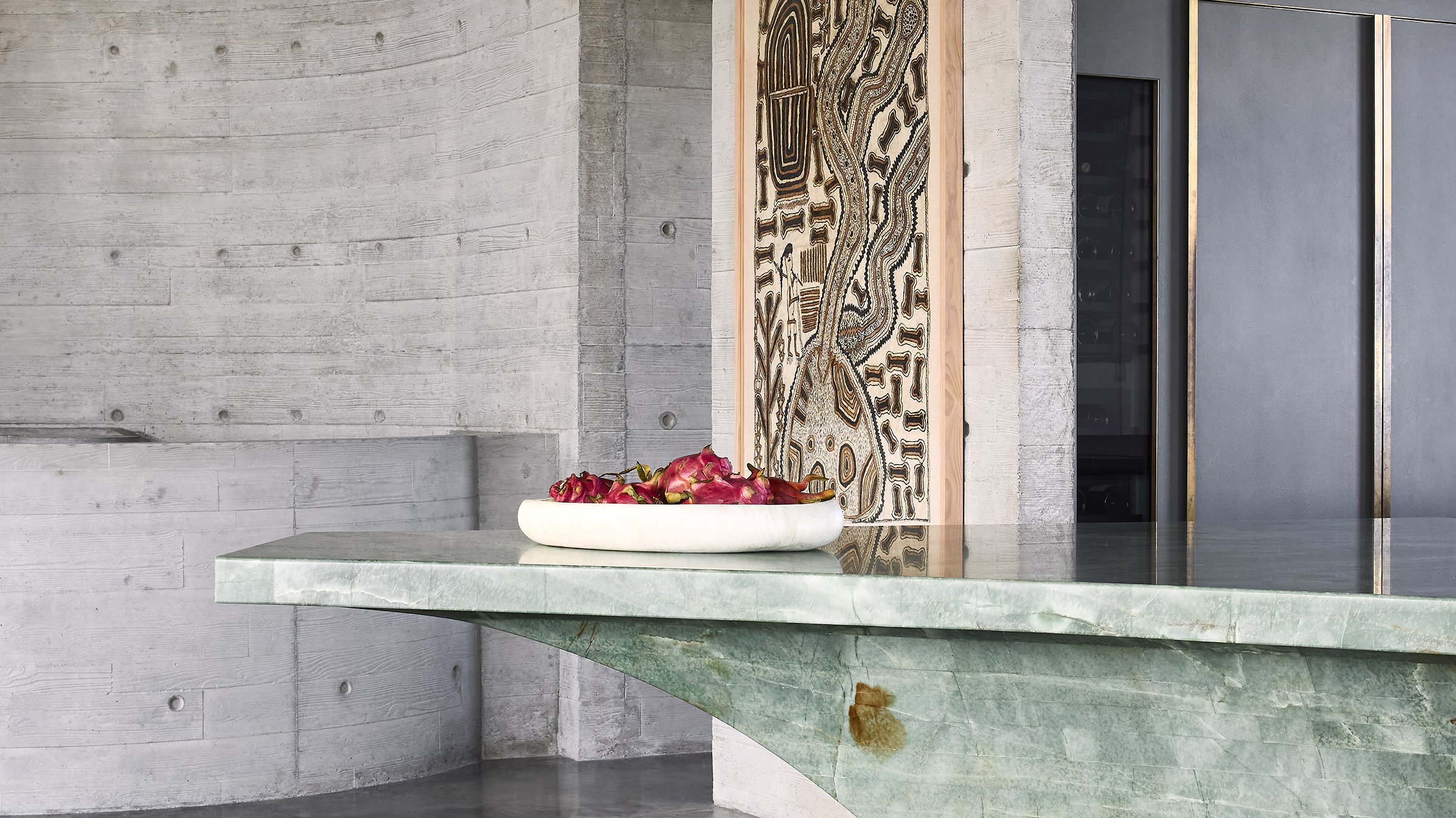 The primary living, dining and kitchen area are orientated towards the wall of ocean-facing windows – all of which retract to waist-height, transforming the space from an enclosed room to a breezy covered balcony. The curving emerald quartzite kitchen island is a natural focal point, creating a subtle distinction between the functional and social parts of the kitchen. Overhead, a rosewood timber ceiling also gently demarcates the working area of the kitchen from the soaring concrete shell around the living room beyond.