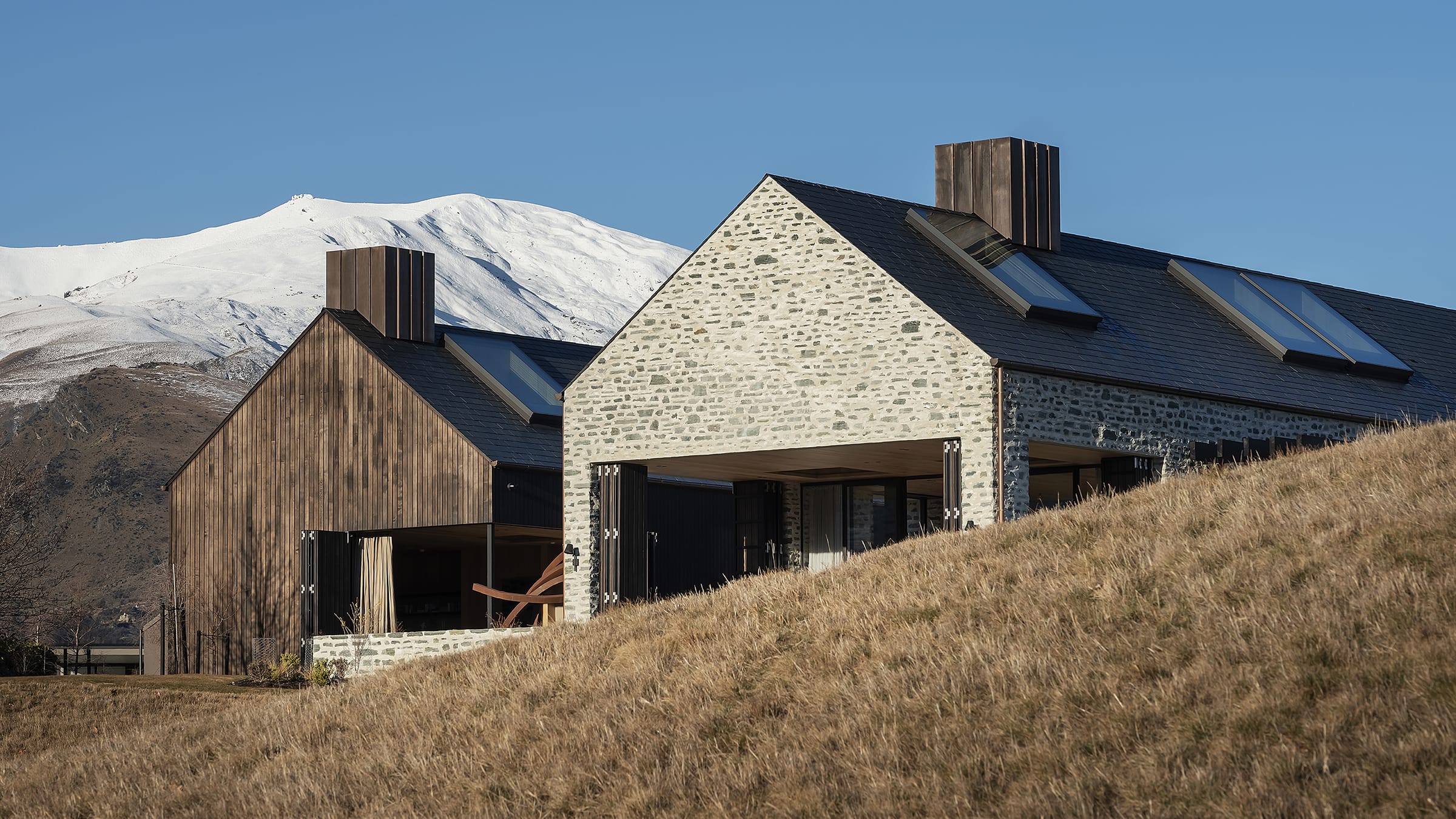 The brief was for a flexible second home that could be both intimate and spacious, catering to its owners alone, or a larger and independent party of guests. The architect conceived it as two related barn-like structures, defined by simple, gabled rooflines, with a portcullis entrance on the streetside building that generates a sense of privacy and protection.
