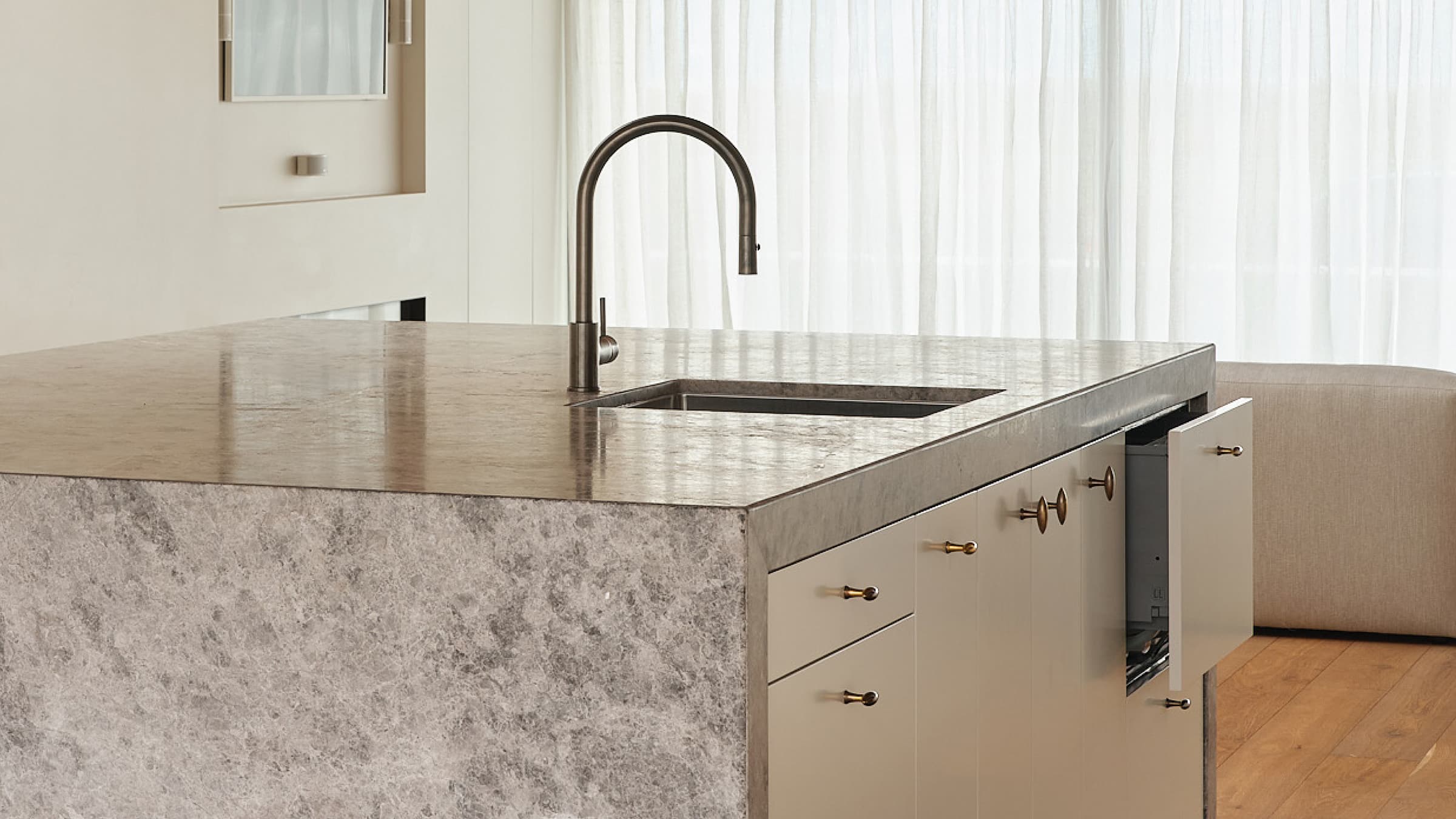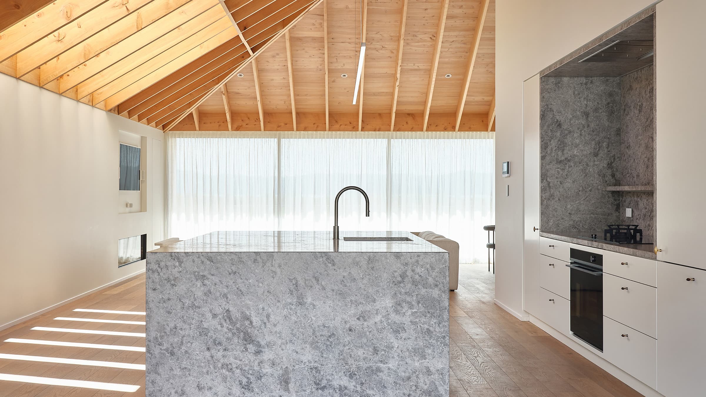 The kitchen features a full suite of Fisher & Paykel appliances. The integrated fridge-freezer blends into the white cabinetry, while a recessed niche faces the monolithic island, both lined with the same grey limestone. Its natural variegation appears softly cloud-like, subtly referencing the moody beach landscape. The rangehood and minimalist black cooktop were installed flush with these surfaces. Below, a sleek Minimal Style black oven recedes from view, contributing to the kitchen's overall visually quiet efficiency