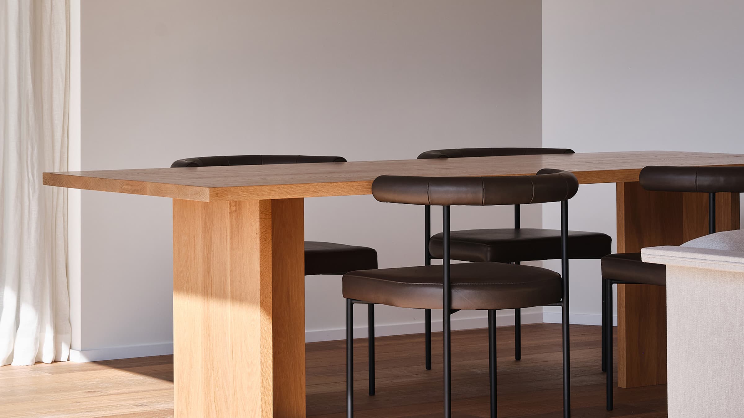 The architects from the local firm Seear-Budd Ross used muted, pale materials that echo the texture and tone of the nearby beach. For example, the weathered timber cladding was selected to resemble silvery-grey driftwood. At the same time, the roof's shape quotes the local architectural vernacular of traditional hip-and-gable construction but elongates it to create a more low-slung, relaxed profile that unifies the exterior and neatly encompasses both the dwelling and its garage.