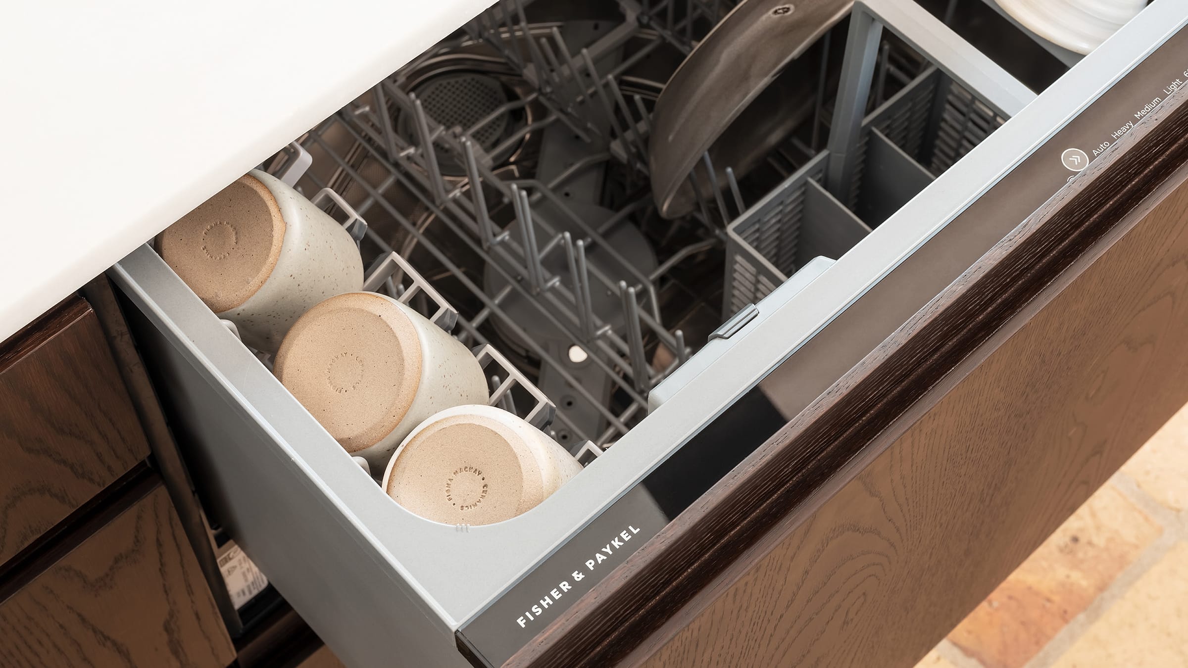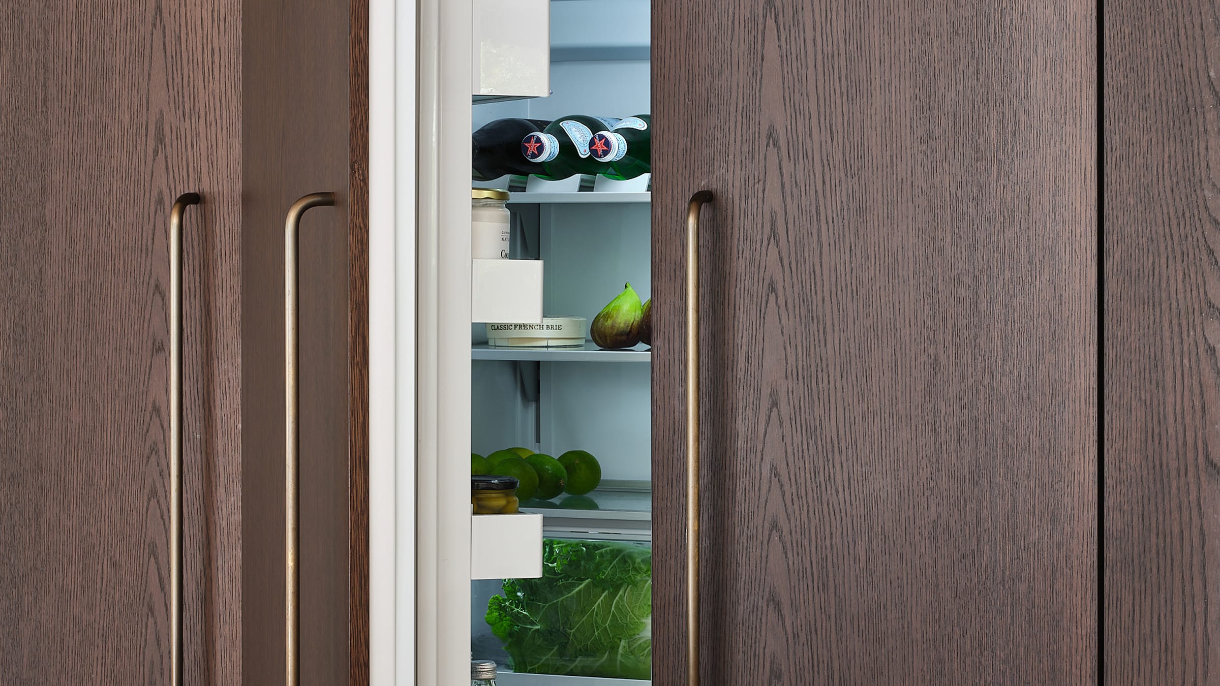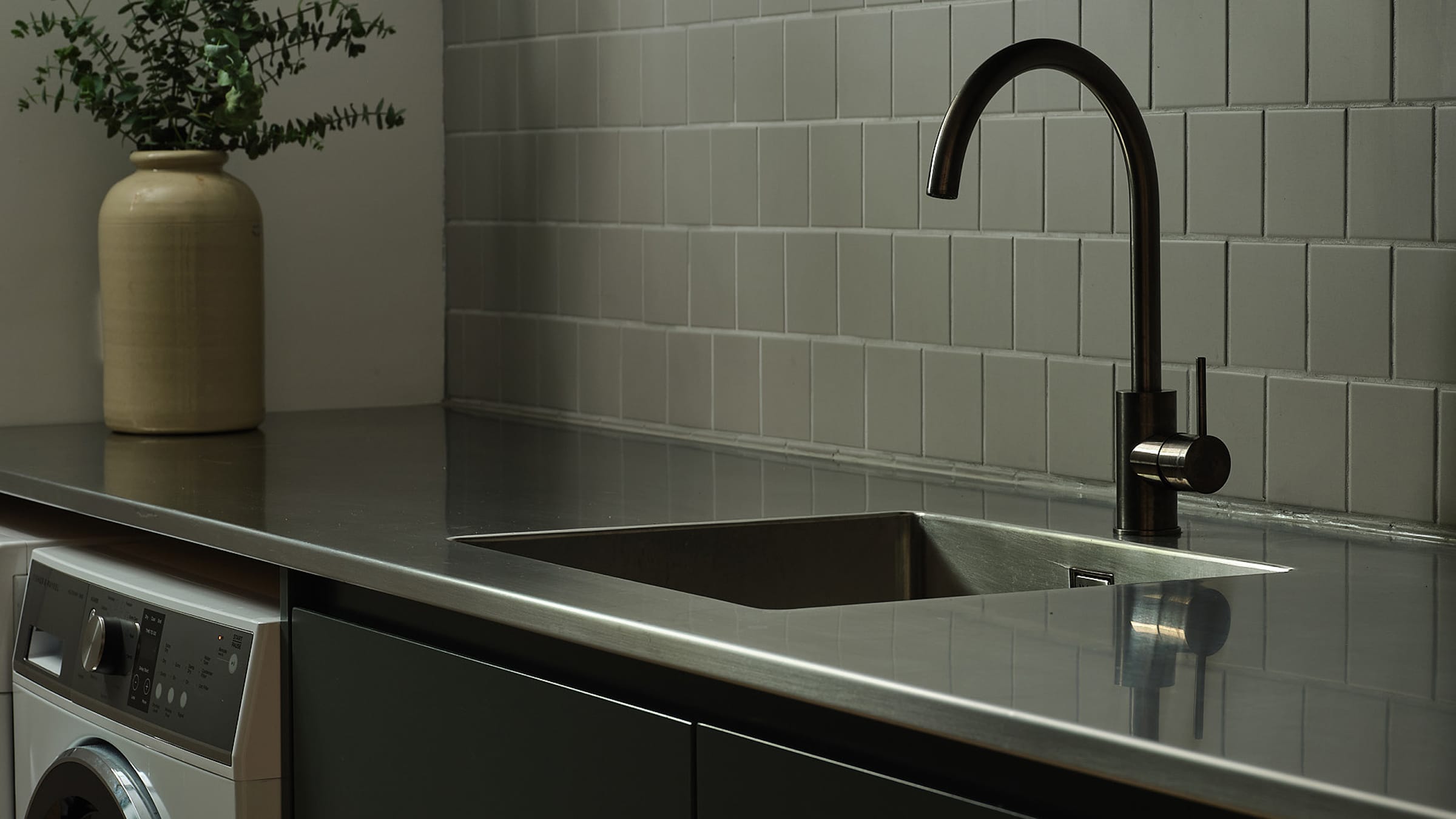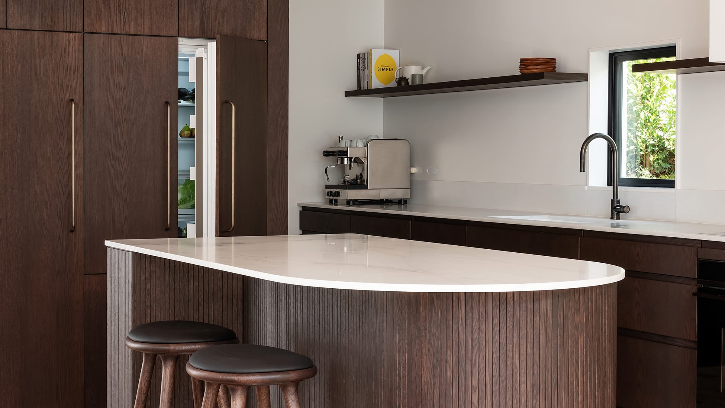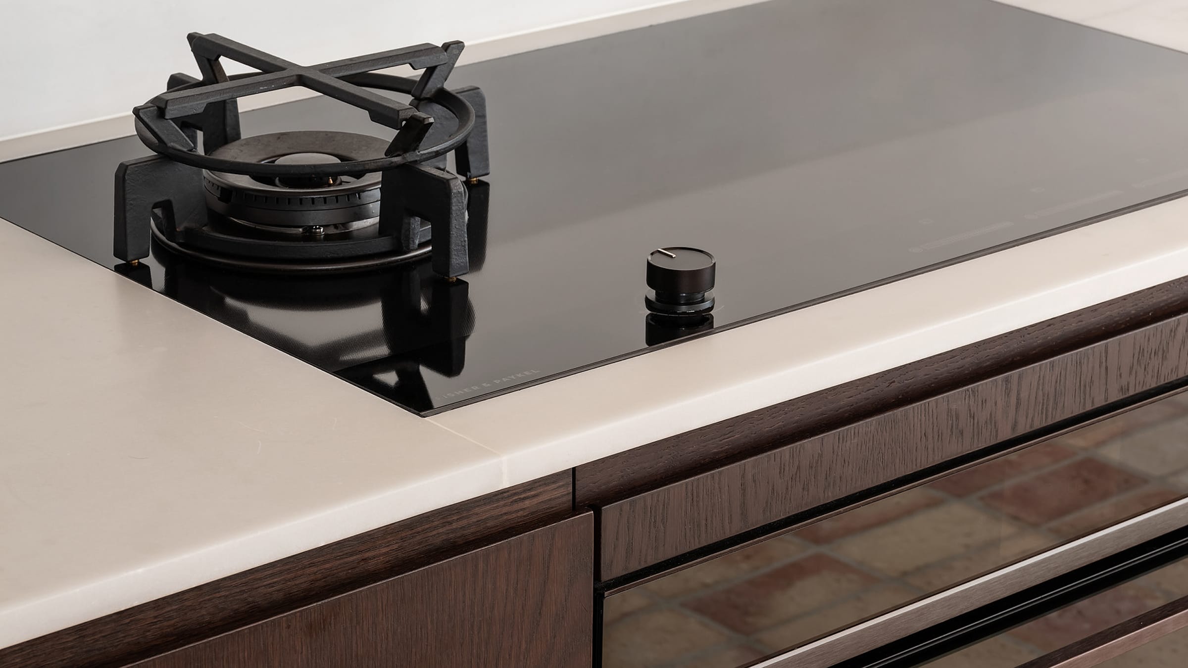 The kitchen is adjacent to the “garden pavilion” of the main living area, and offers an uncluttered yet warm aesthetic, featuring minimal detailing and dark oak cabinetry above the salvaged red-brick floor. Most of the appliances were either fully integrated into the joinery or, like the induction cooktop and wok burner, are so streamlined they sit almost invisibly within the scheme.